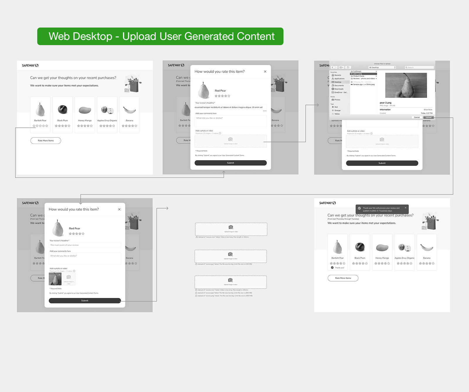 For phase 1 we decided to create an experience that would allow a user to upload their own media (images + videos) and associated to their product review. If using OS device leverage native features to create a seamless experience.